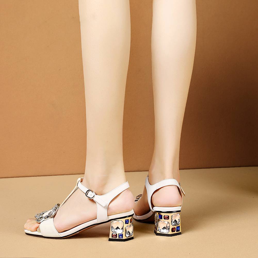 Sandalias de tobillo con tiras en T con decoración de diamantes de imitación y cierre de hebilla