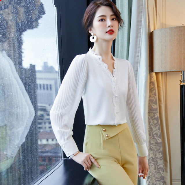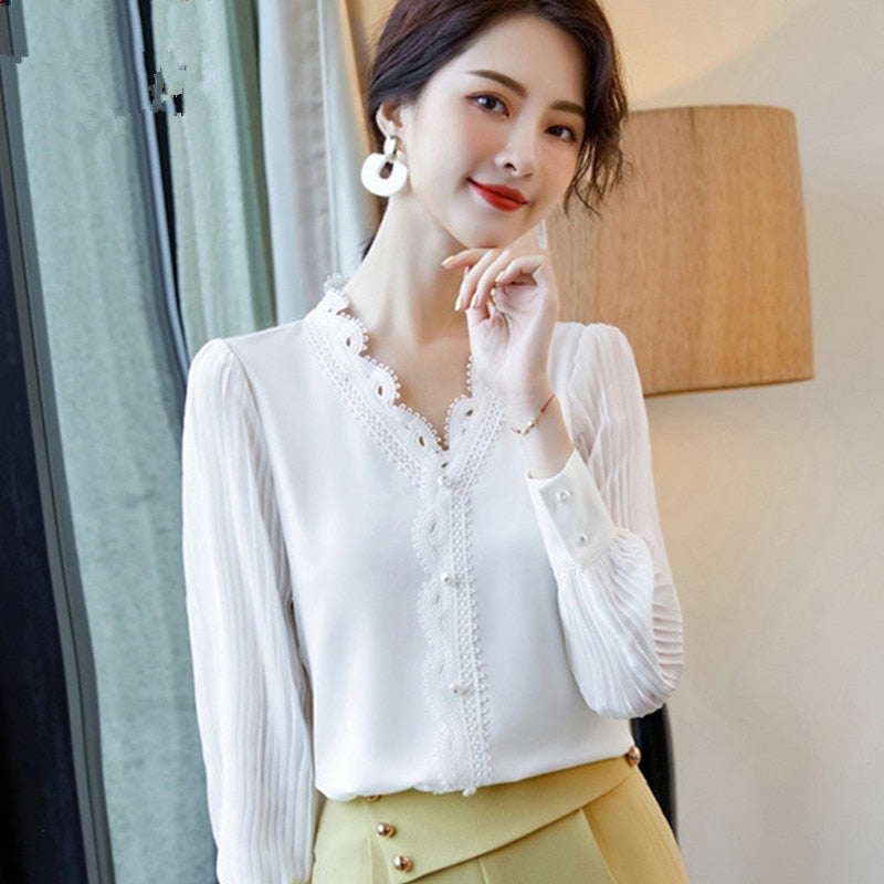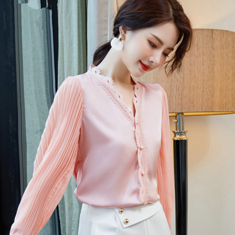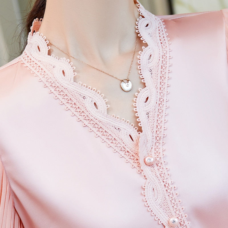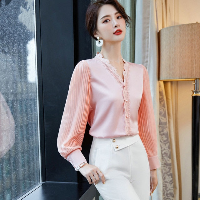 This elegant satin shirt with a lantern sleeve provides a feminine and elegant look that is perfect for any special occasion. Floral lace trim adds a stylish touch to the classic shirt.