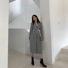 Vestido midi con cuello en V, manga larga, cinturón con adorno y material de algodón y poliéster