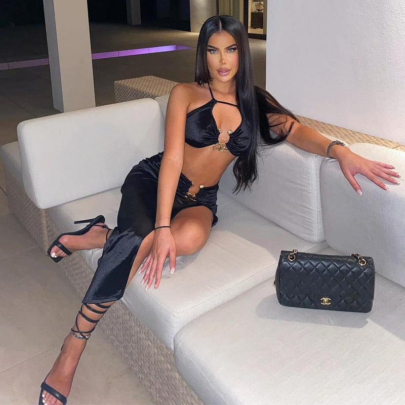 This sleek skirt set is a wardrobe staple for any outfit. The spandex material makes it perfect for dance, dinner, or any other activity. The midi skirt and the crop top is a perfect combination.