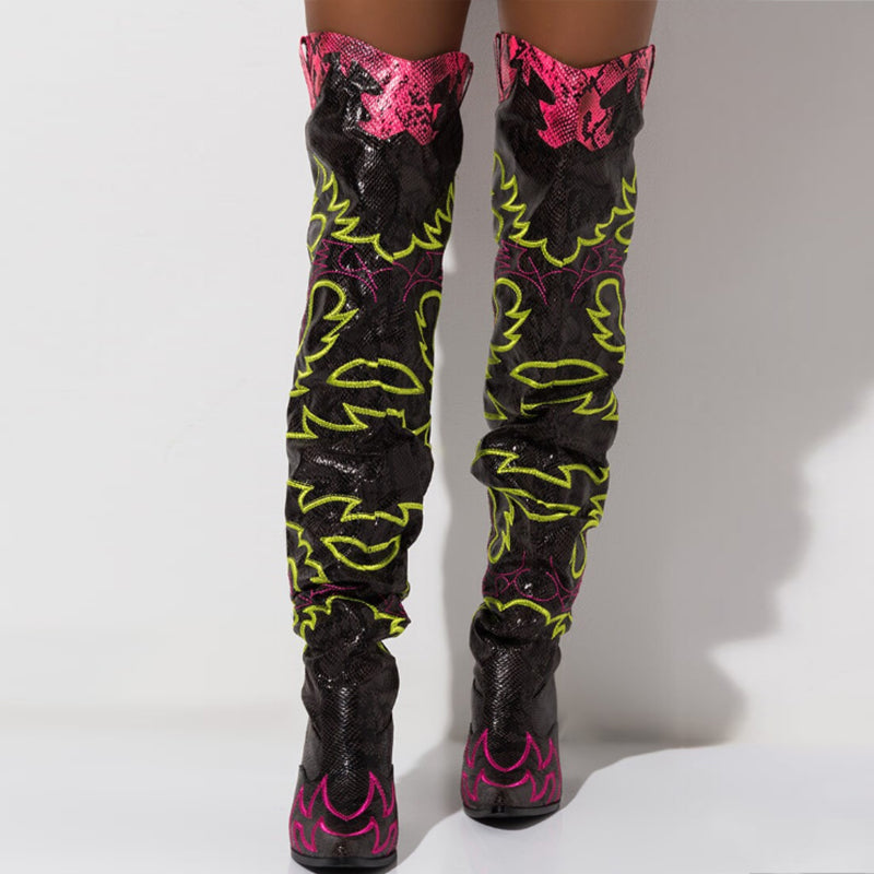 <transcy>Botas sobre la rodilla con punta puntiaguda bordada de vaquera occidental</transcy>