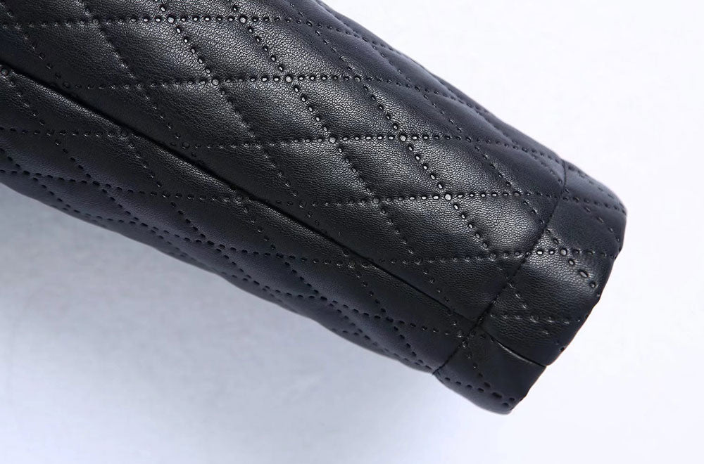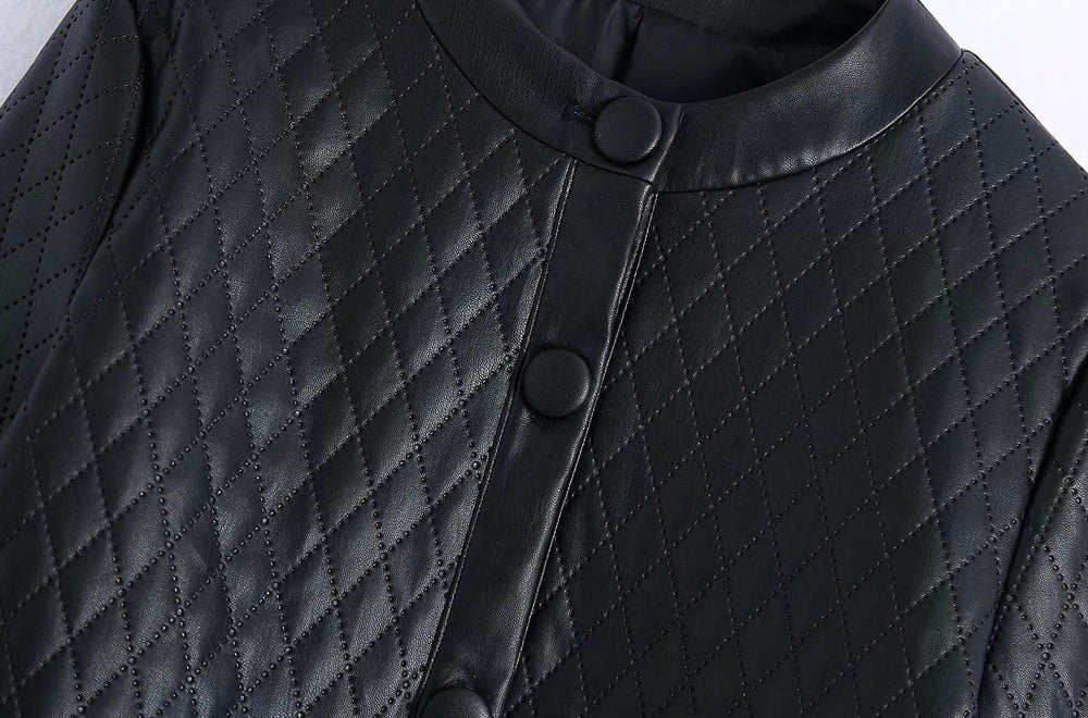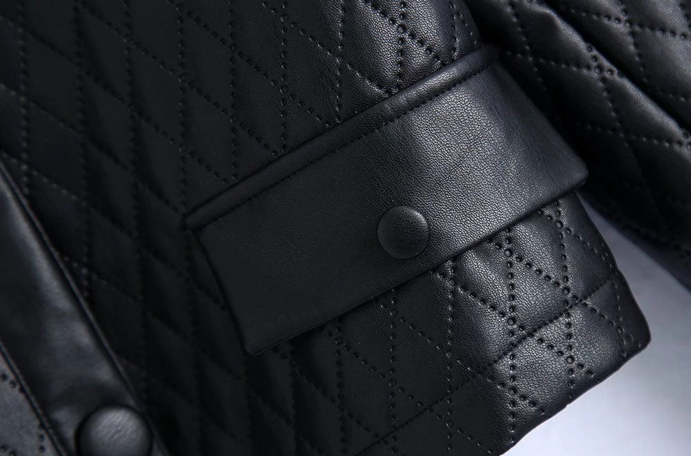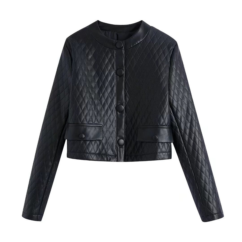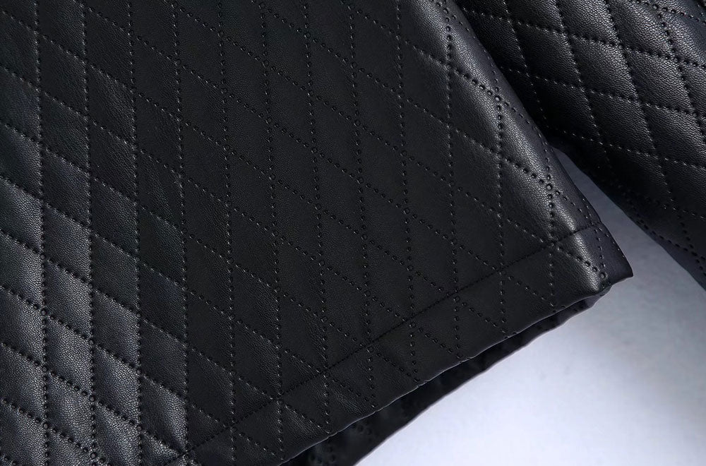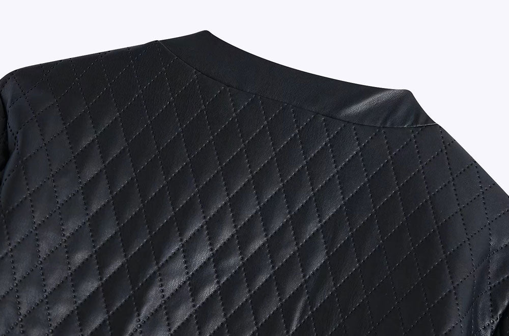 The subtle argyle pattern adds a trendy twist to this versatile faux leather jacket. A single-breasted closure ensures a sleek fit that looks great with any outfit. This faux leather jacket is a must-have for fashionable women who are always on the go.
