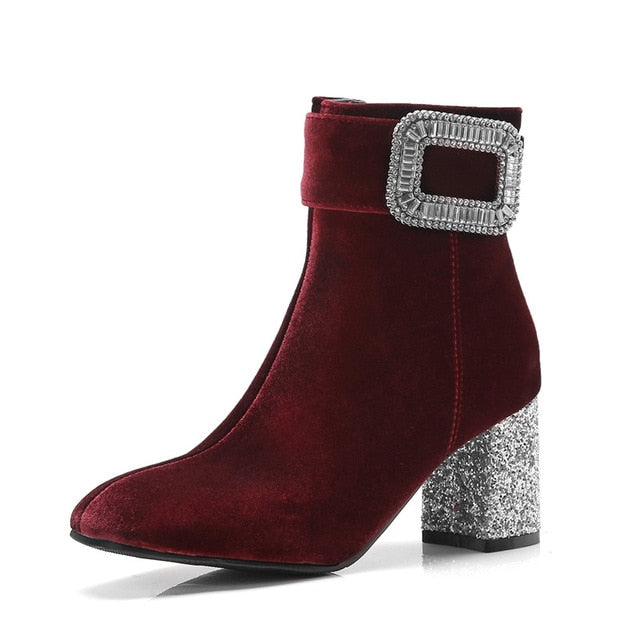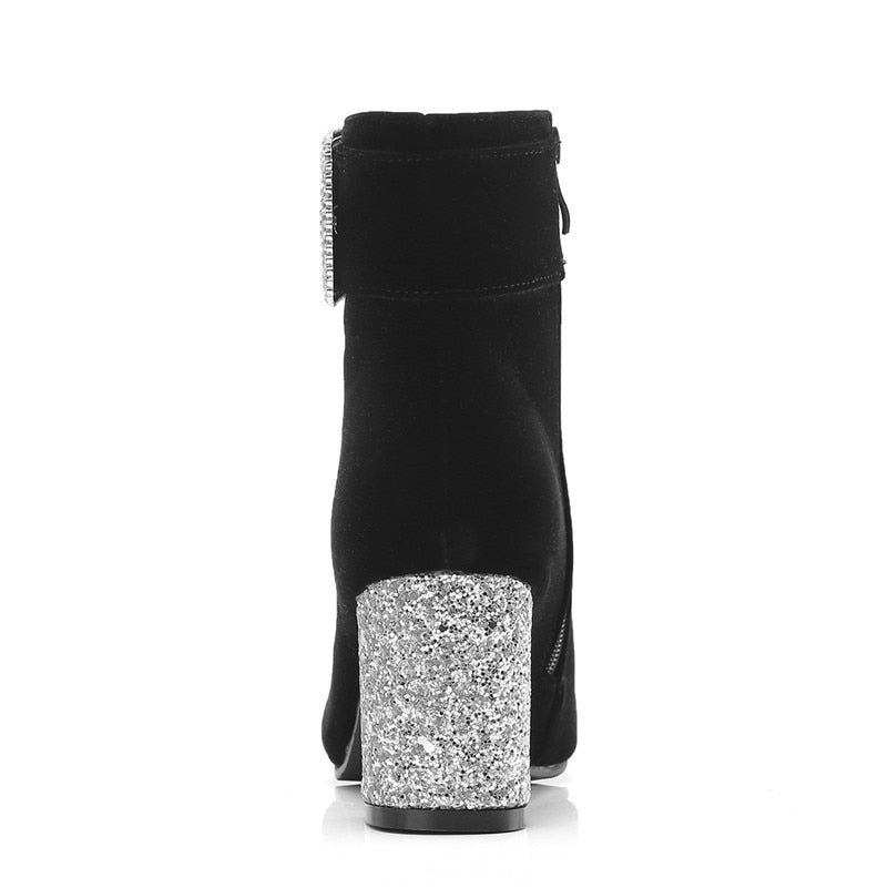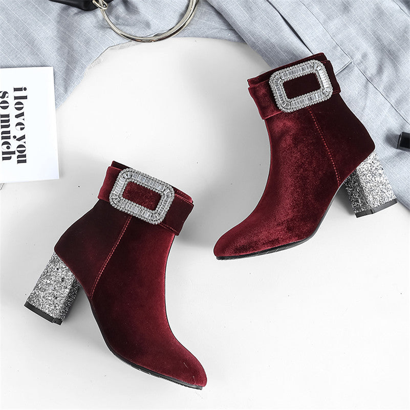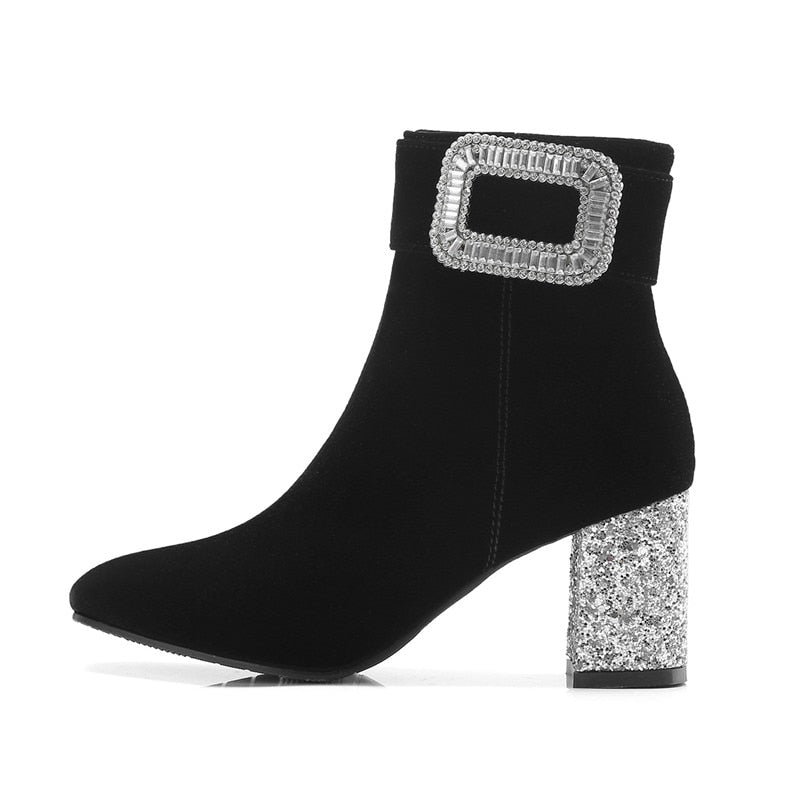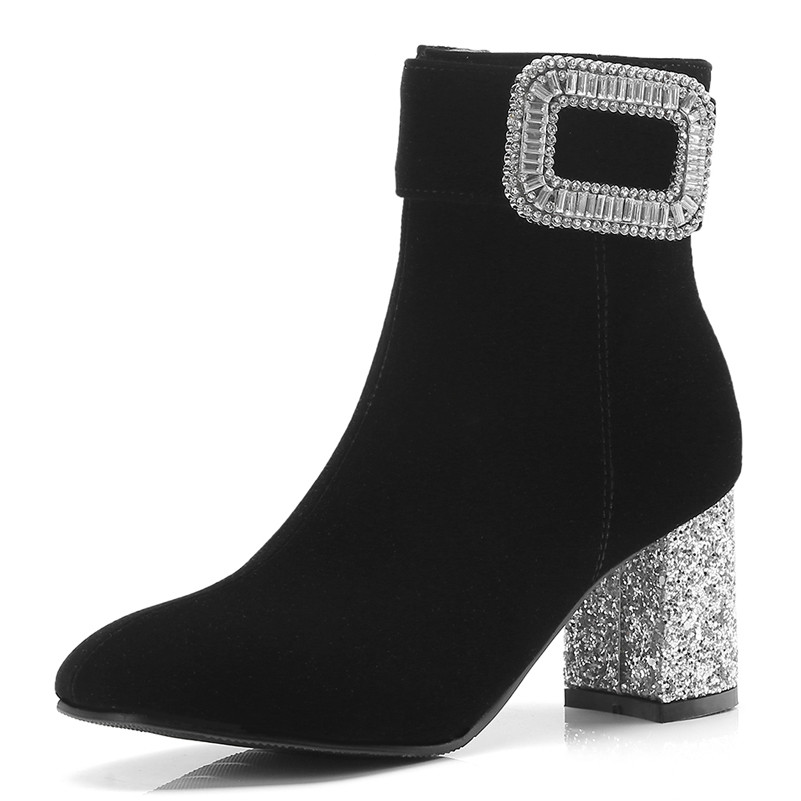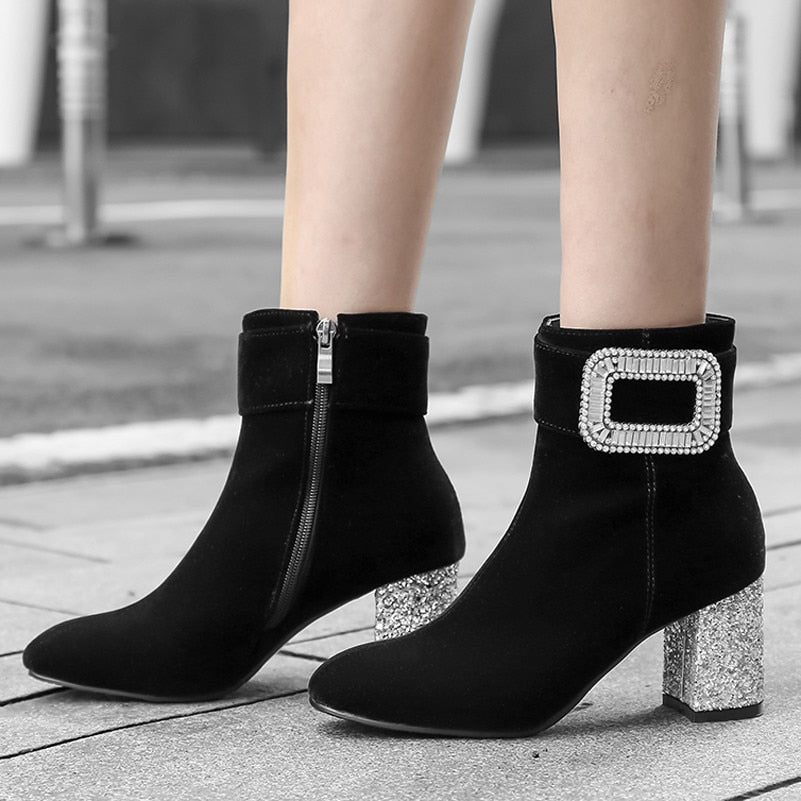 <transcy>Hebilla de diamantes de imitación flocada con tacones gruesos con cremallera</transcy>